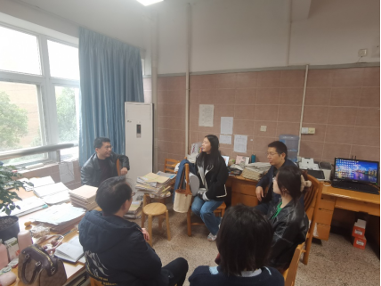 任美衡院长一行在明德中学与指导老师黄金萍及硕士研究生张红明交谈
