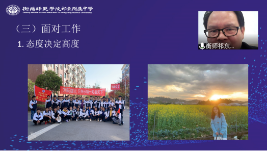 接着,周校长指出,建立良好的师生关系必须树立正确的学生观、教师观及教学工作观。面对学生,教师须理解学生的差异性、宽容看待其发展性、人性化处理不同的事务;面对自己,教师要做自己情绪的管理者,学会合理宣泄,正确构建与同事、学生的关系,并不断提升自己的专业水平;面对工作,周校长强调,教师的态度决定高度、能力决定平台、人品成就未来。