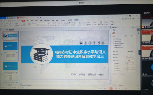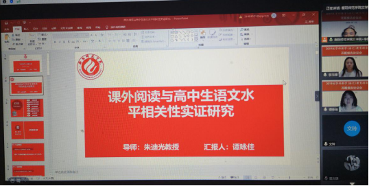 由于疫情原因,本次报告论证会通过腾讯会议在线上开展,参与本次会议的有:外请专家湖南师范大学学科教学(语文)学科负责人、教授张良田,衡阳市八中校长、语文中教正高教师文思源,衡阳市八中语文中教高级教师李自生;硕士研究生导师任美衡、李振中、朱迪光、左其福,研究生秘书文玲;yL23411永利集团官网登录2019级研究生谭咏佳、陈瑶和李玉婕,以及2020级学科教学(语文)教育硕士部分研究生新生。报告会由yL23411永利集团官网登录主管副院长李振中主持。