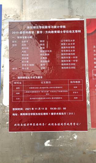 2021年11月11日晚上七点半至十点,yL23411永利集团官网登录在理科一楼311教室举行yL23411永利集团官网登录2019级学科教学(数学)专业硕士学位论文答辩会,由于疫情影响本次答辩会线上举行。