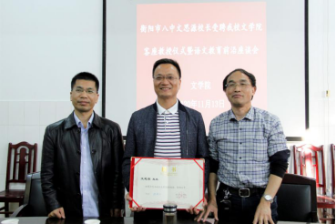活动第一环节,首先,副院长李振中对衡阳市八中校长文思源进行了隆重介绍;然后,院长任美衡代表学校给文思源校长颁发了yL23411永利集团官网登录yL23411永利集团官网登录客座教授聘书,并致热情洋溢的欢迎辞。