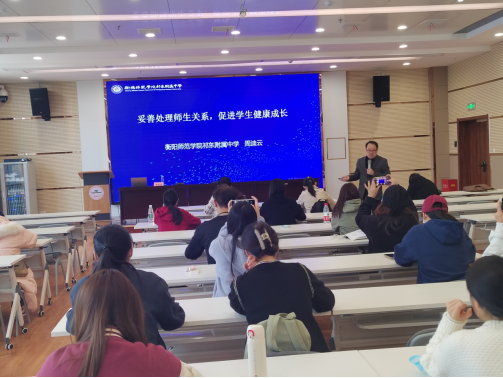 首先,周迪云老师围绕“什么样的老师受学生欢迎”“如何建立良好的师生关系”“怎样做学生生命中的贵人”等三个问题展开交流。他结合长期从事中学学生工作管理的经验,通过一系列的生动、真实的案例和调研的数据进行诠释与深入剖析,既有理论高度又通俗易懂,且对实践有较好的指导作用。